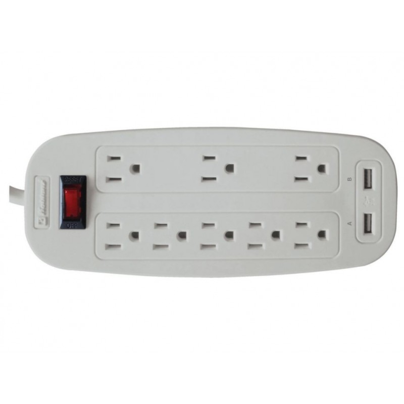 CaracterísticasContactos aterrizados, 2 puertos USB, protección 2100 Joules y switch reset iluminado de 10 Amp