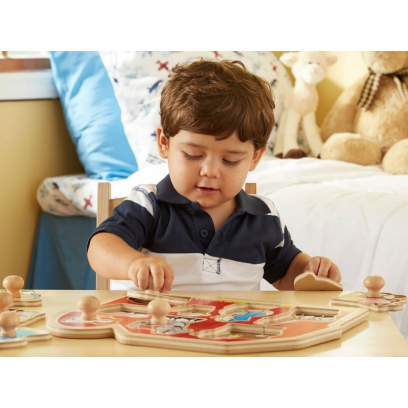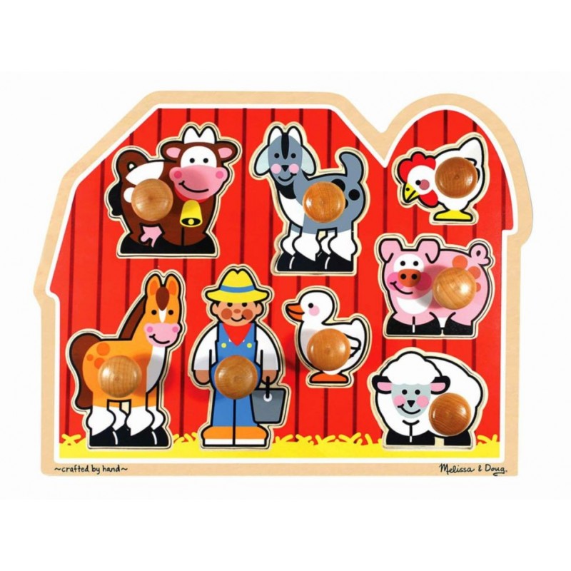 Contiene 7 animales favoritos de la granja y un granjero frente a un gran granero rojo. Este extra grueso rompecabezas de madera incluye 8 piezas con clavijas fáciles de poner. Imágenes a todo color coincidentes se muestran debajo de cada pieza. Estimula la coordinación de mano y las habilidades de percepción visual