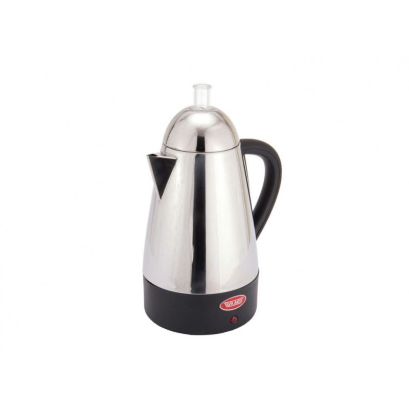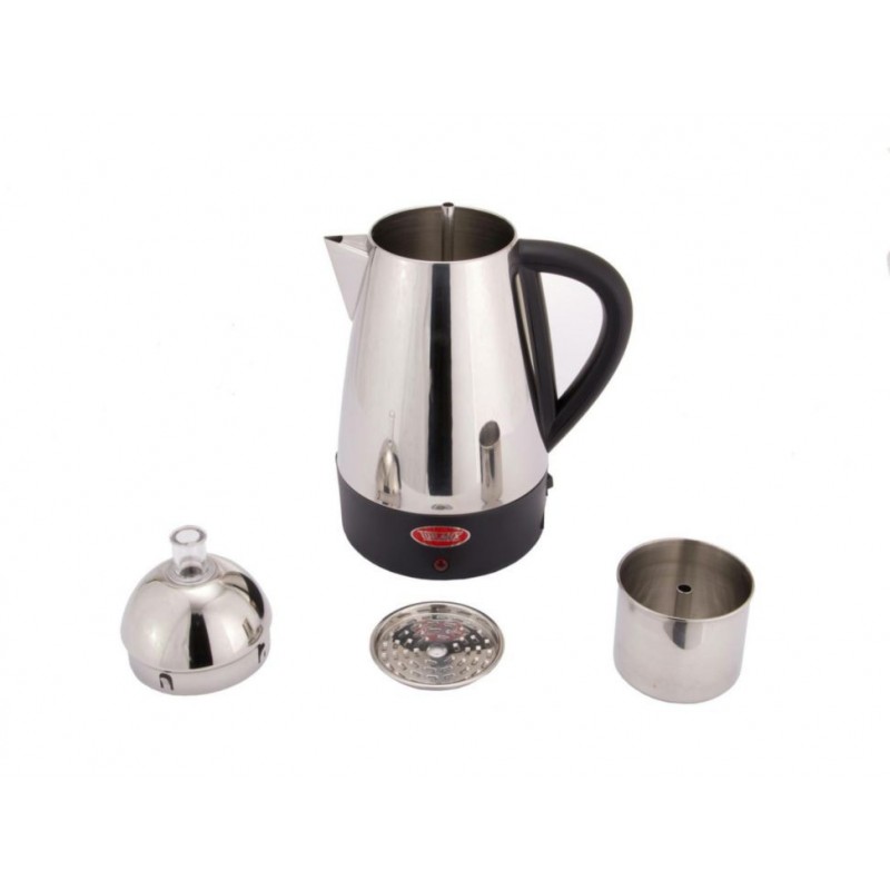 Otra InformaciónCafetera de acero inoxidable, sistema: percoladora, capacidad de 1.5 litros para 10 tazas, dimensiones: 34 cm X 21 cm X 21 cm con interruptor de encendido y apagado, consumo de energía: 800 watts, equipamiento interior: filtro para infusión. Lavar con agua y jabón, no usar fibras, secar perfectamente antes de usar