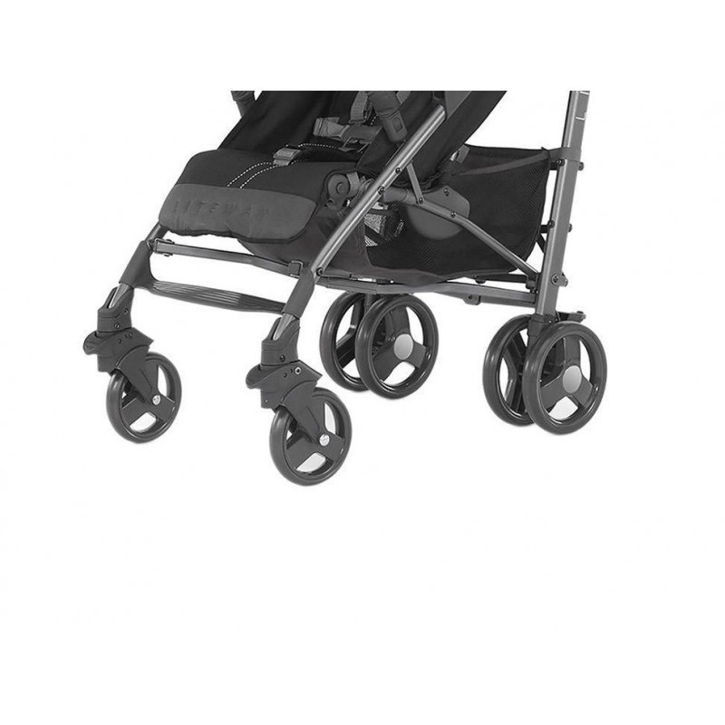 Otra InformaciónLas dos ruedas dobles traseras garantizan el máximo confort durante las salidas y tienen freno. Las ruedas delanteras son de giro libre aunque se pueden fijar para que giren recto. Gracias a la forma ergonómica de las empuñaduras, se puede empujar la silla con comodidad. Además, están recubiertas de un material suave y antideslizante
