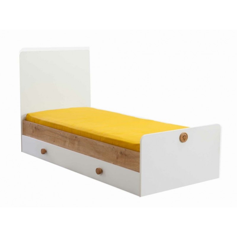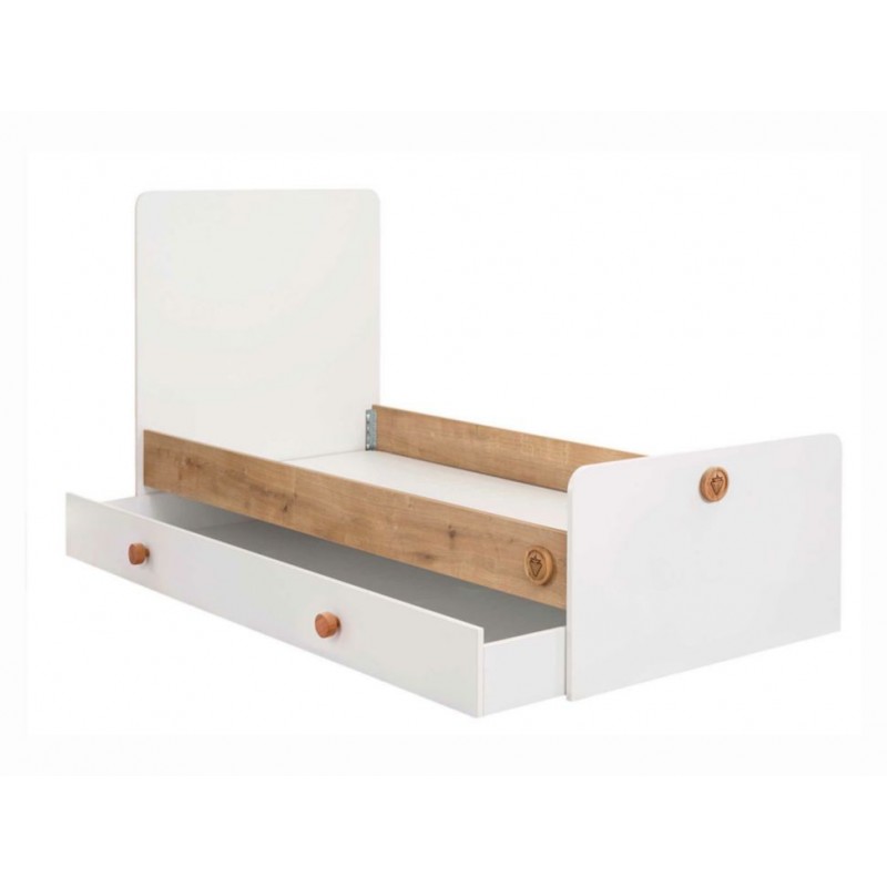 Sistema de seguridad frontal de elevación del barrote con añadido de las funcionalidades extraíbles. Una vez que la cuna haya sido convertida en una versión más larga, la cabecera de la cuna puede elevarse gracias a los perfiles laterales de metal. Imagen ambientada ilustrativa.