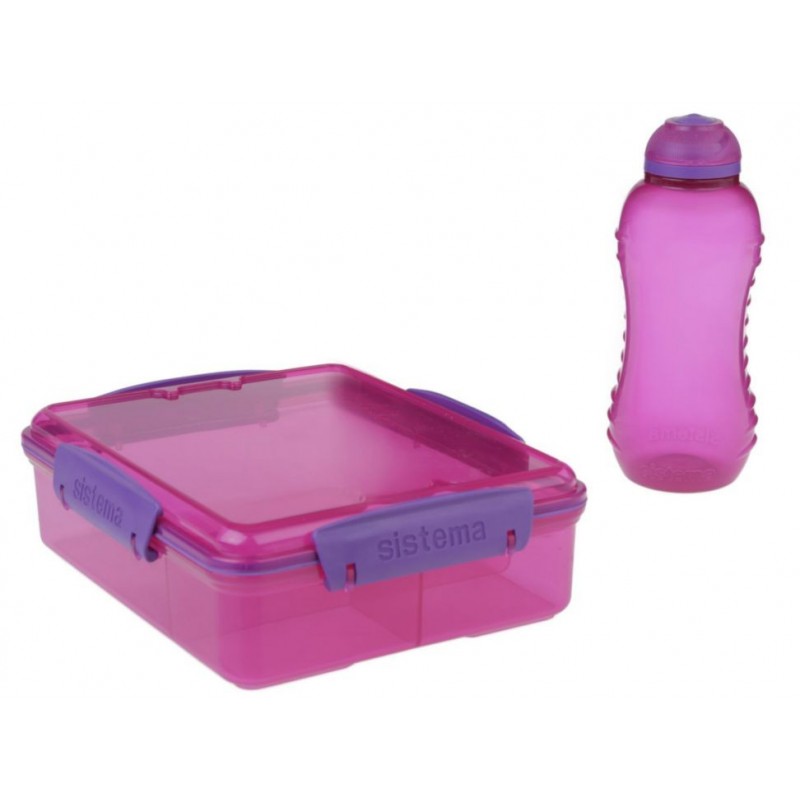 DetallesSandwichera con compartimentos y tapa hermética para evitar derrames. Botella ergonómica con antiderrapante a los costados
