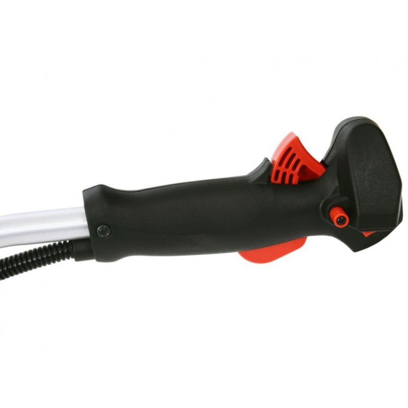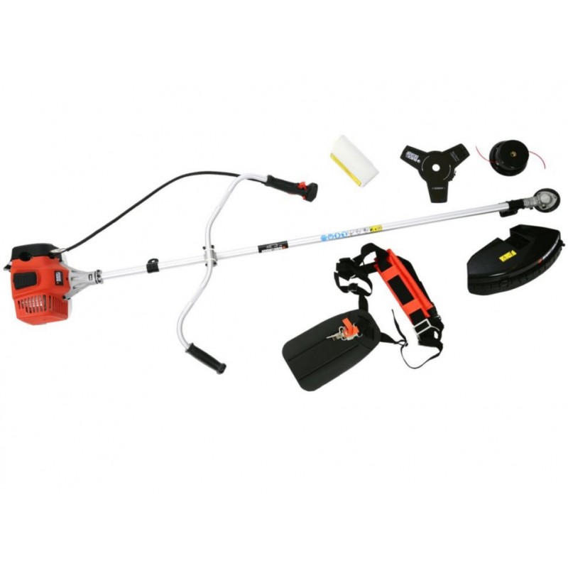 Poderosa desbrozadora / podadora a gasolina profesional de 1.2 HP (0,9 kW), cabezal removible para uso con cuchilla de tres puntas o nylon, con una cilindrada de 33 cc y sistema de encendido Easy-Start. Veocidad de 6500 rpm con la ayuda de un motor a dos tiempos