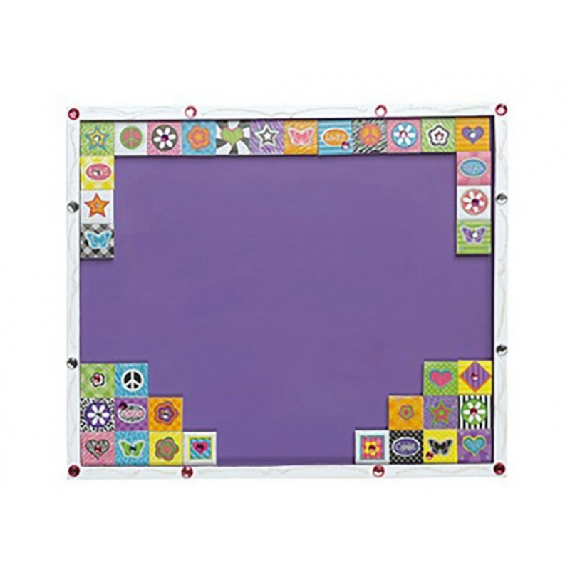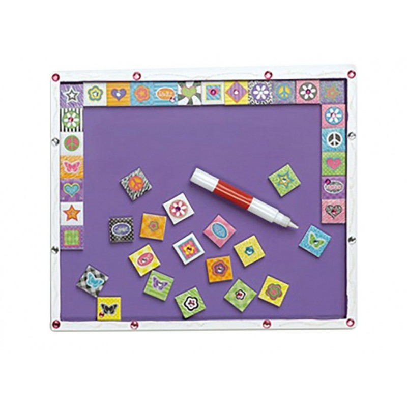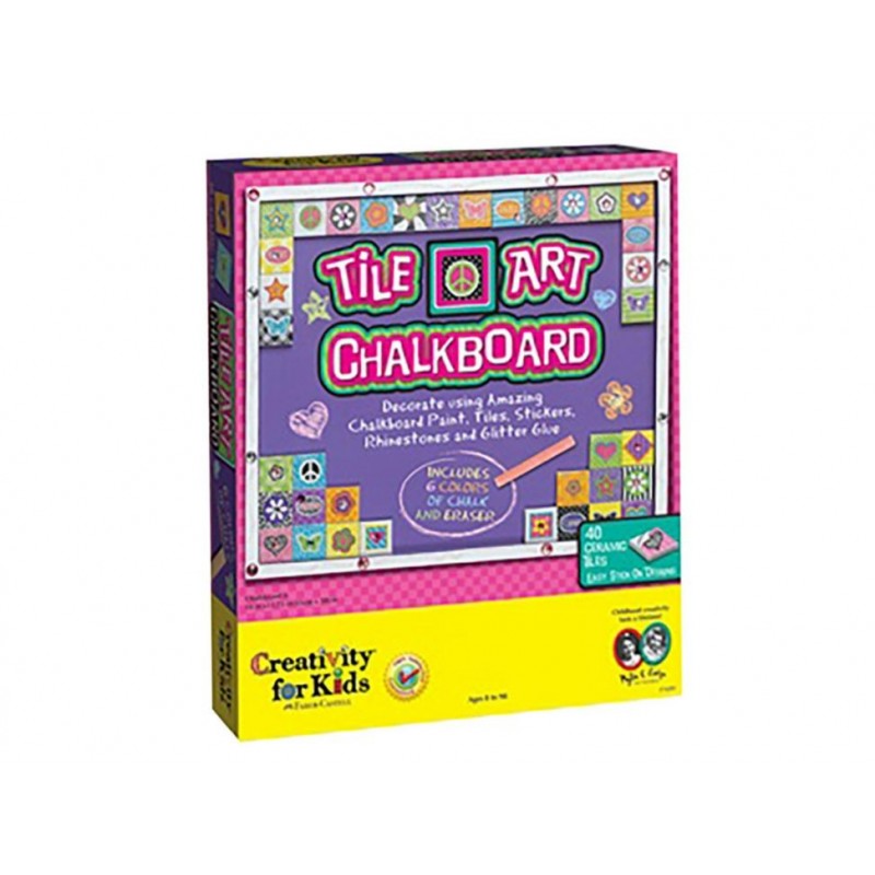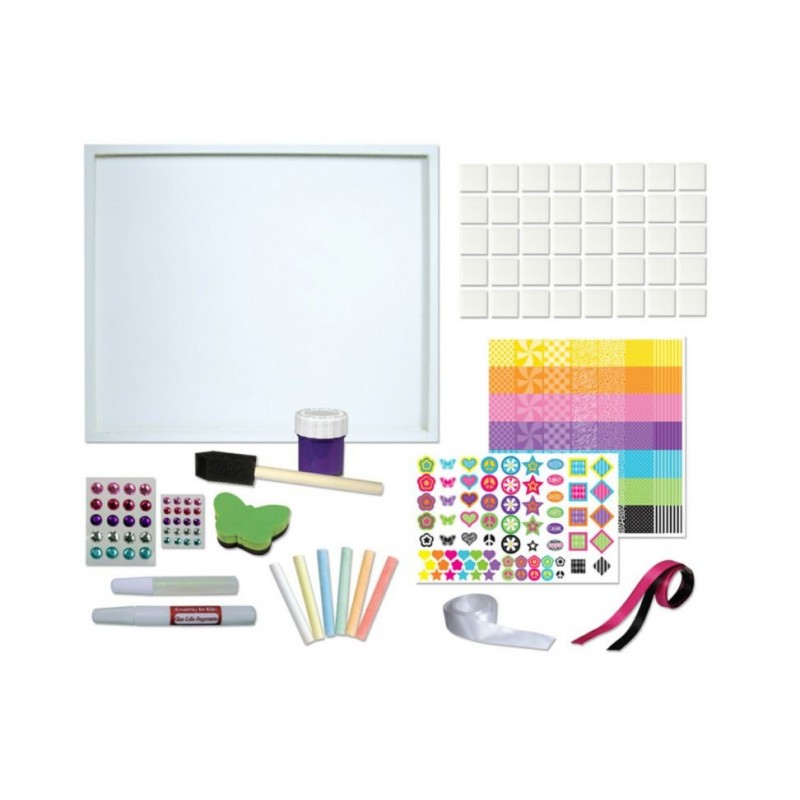 Contenido12 mililitros de pintura, 40 cuadritos de cerámica de 2.5 x 2.5 centímetros, 3 listones, 15 mililitros de pegamento, 10 mililitros de gel brillante, brocha de esponja, set de pedrería auto adherible, 6 gises, una goma con forma de mariposa y estampas auto adheribles