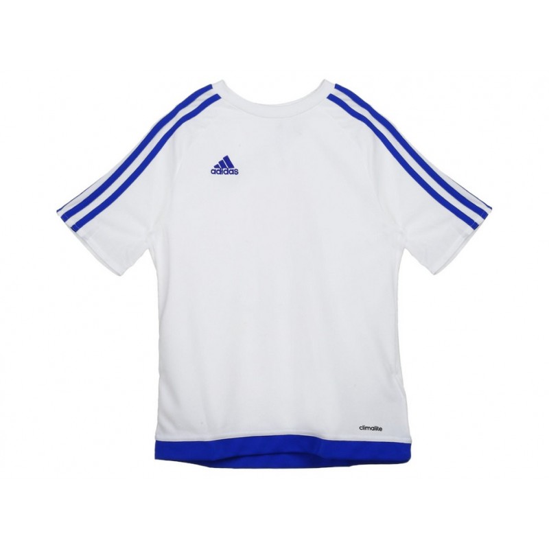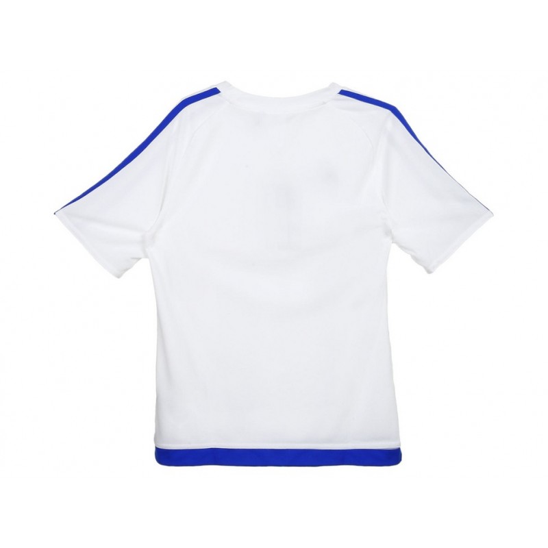 Playera con nombre y logo de la marca en parte superior derecha, franjas distintivas de Adidas en hombros, costuras planas; confección ligera y suave