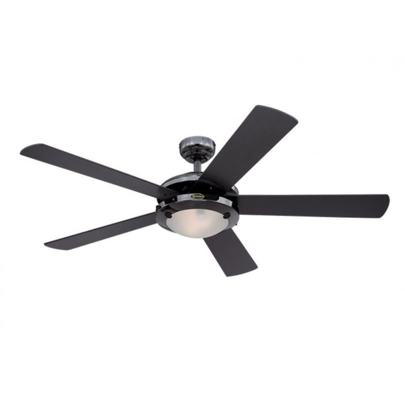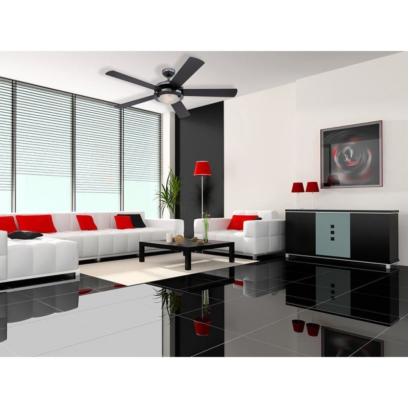 Detalles5 Aspas reversibles de madera laminada acabado negro / grafito kit de luz con vidrio , motor de acero laminado en Frío : 153 mm x 15 m ,Inclinación de aspas 11 , opción doble montaje (plafón y varilla) con interruptor de reversa (verano / invierno) , adaptable para control remoto