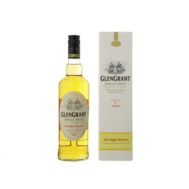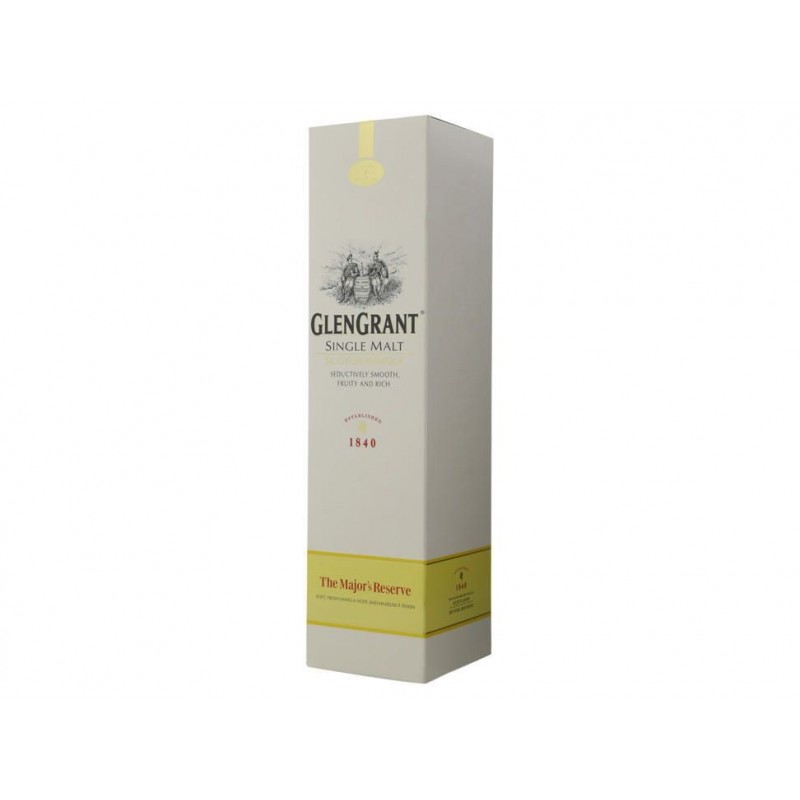 Whisky Glen Grant The Major's Reserve single malt, este whisky de malta puro, fácil de beber , es el más fresco y suave de la gama Glen Grant. Cremoso y afrutado en el paladar, con una terminación ligeramente seca y almendrada. Madura en barricas de bourbon